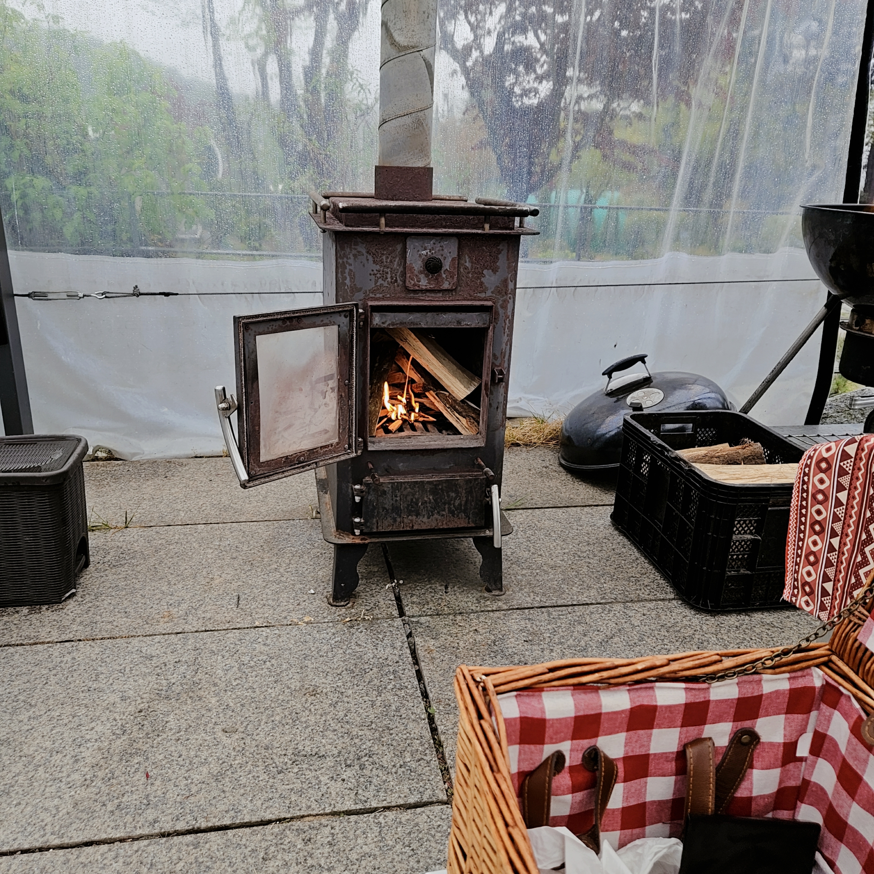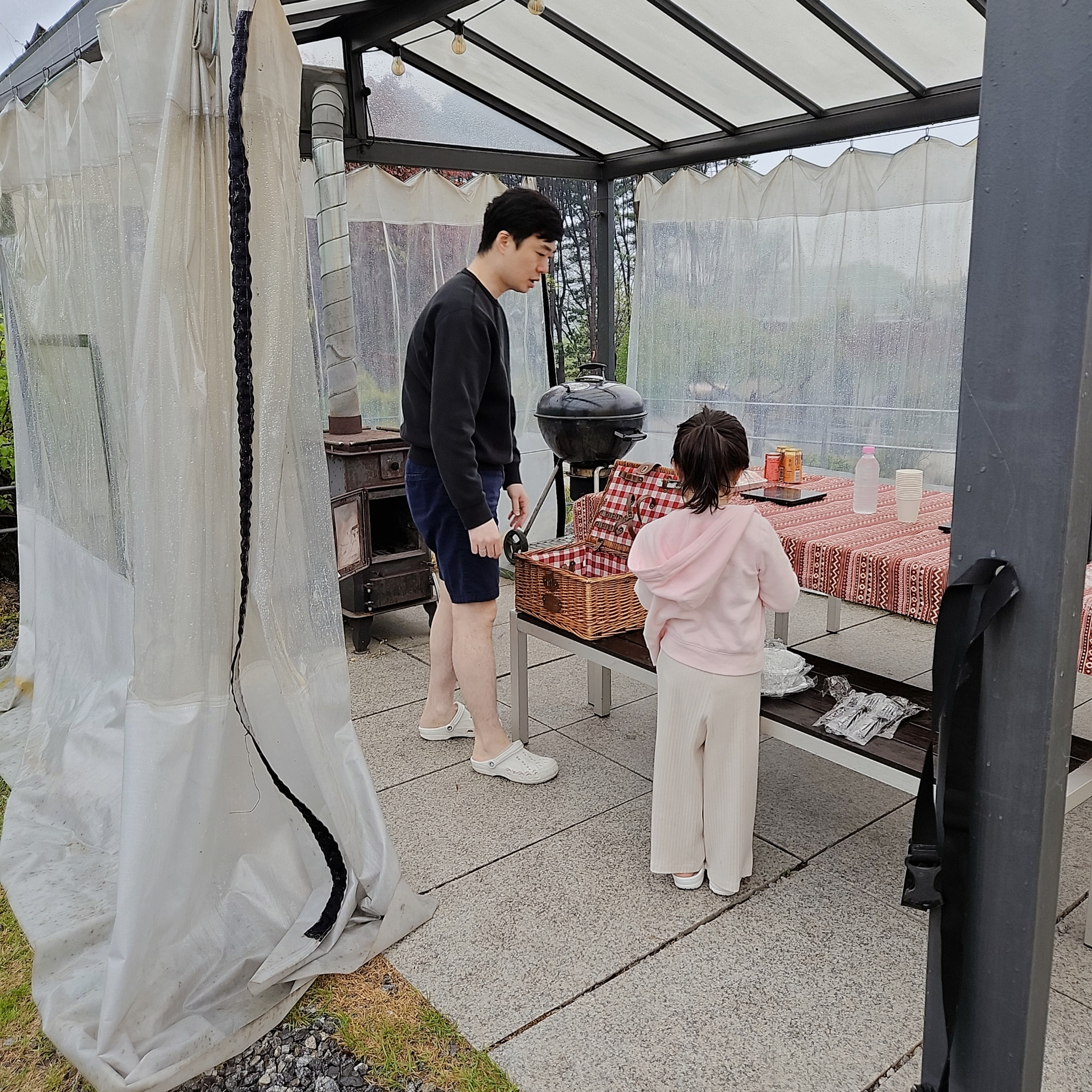 글램트리에서 부처스컷 바비큐 세트를 구매하거나, 직접 고기를 가져와서 구워먹을 수 있어요. 숯(₩30,000)과 장작(₩30,000)은 체크아웃 시 결제, 불은 직원분이 직접 와서 붙여줘요. 난로에는 고구마를 굽는 작은 서랍도 있어서 진짜 캠핑 감성 물씬!